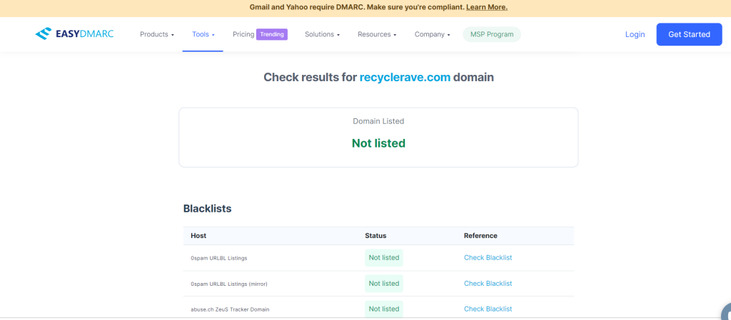 As an extra step before purchase, check for the domain reputation to ensure that you’re not purchasing a blacklisted domain that could cause unnecessary headaches. Simply go to easydmarc.com and input your domain. As you can see from the results below, it’s clean.