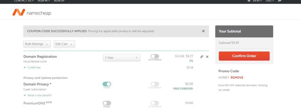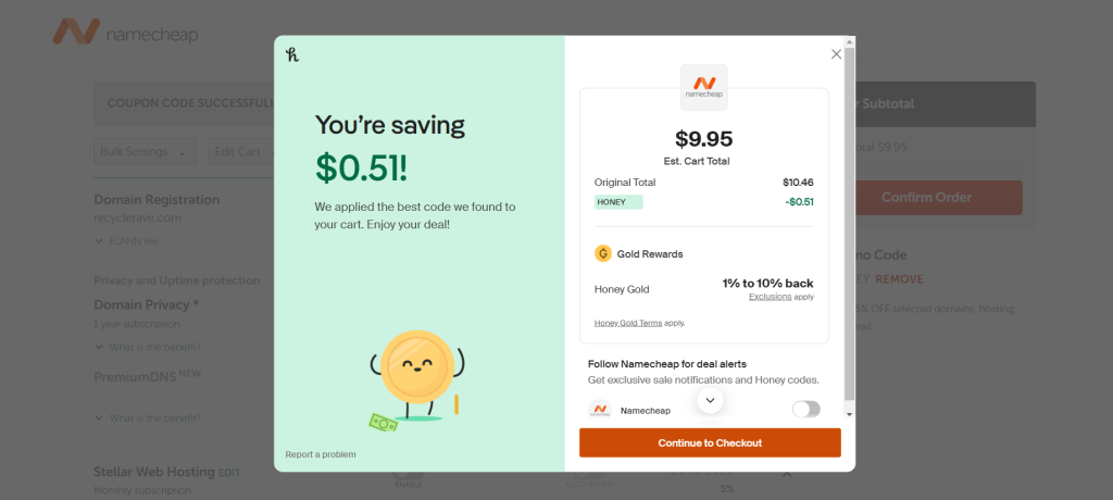 next step is to actually register the domain. use honey to snatch up some discounts as seen in the screenshots below. $10.46 before the discounts and after applying the discounts becomes $9.95.